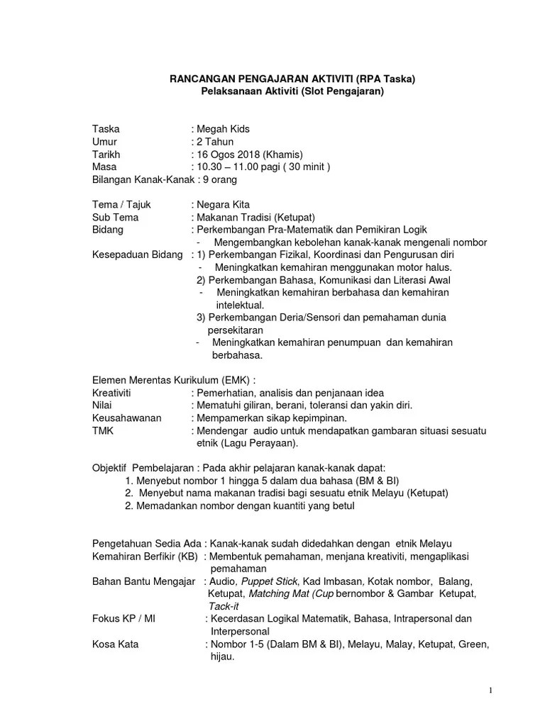 Rancangan pelaksanaan aktiviti taska slot pengajaran kelas. Contoh rpa perkembangan bahasa 4 tahun malayfuad.